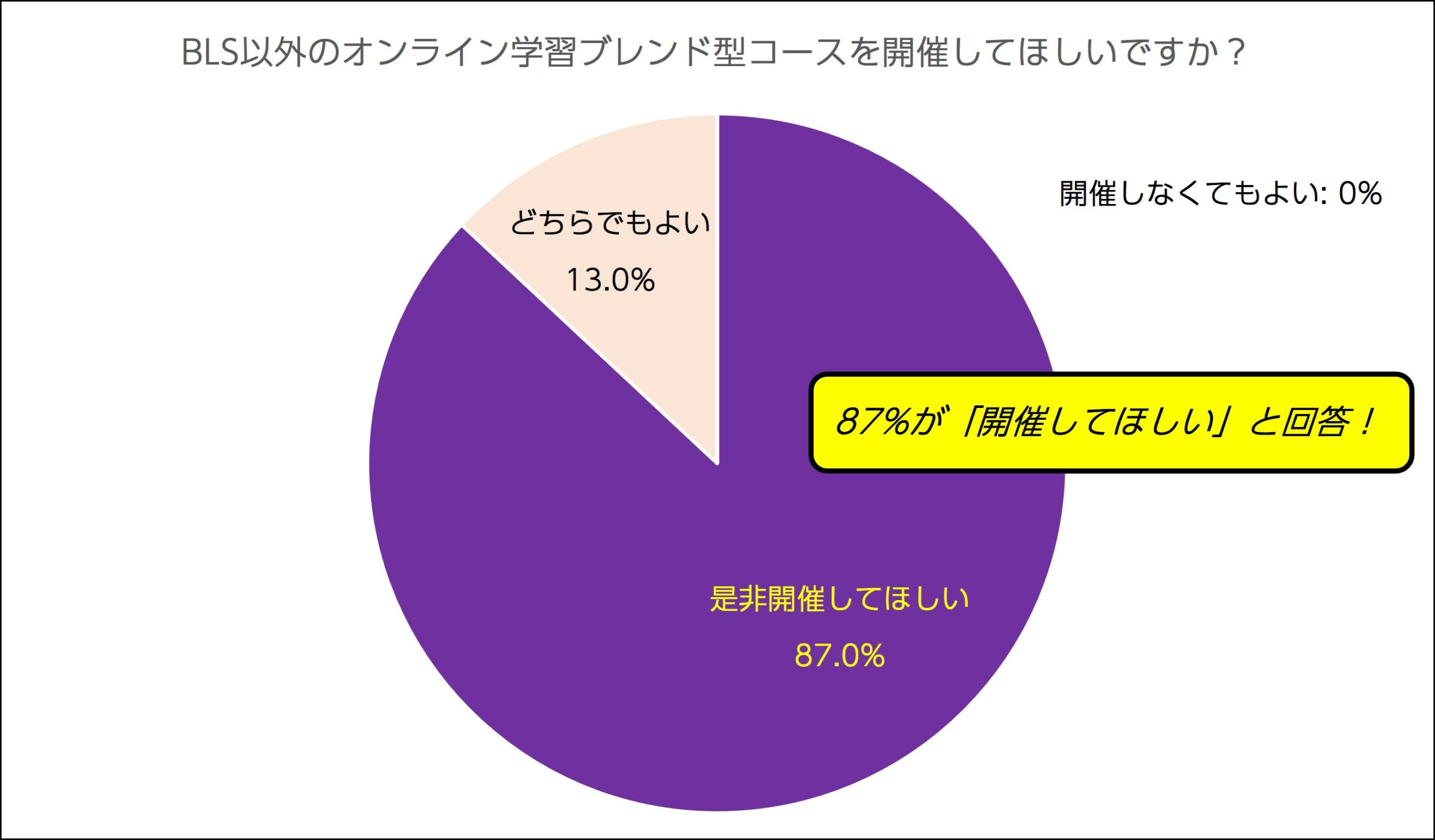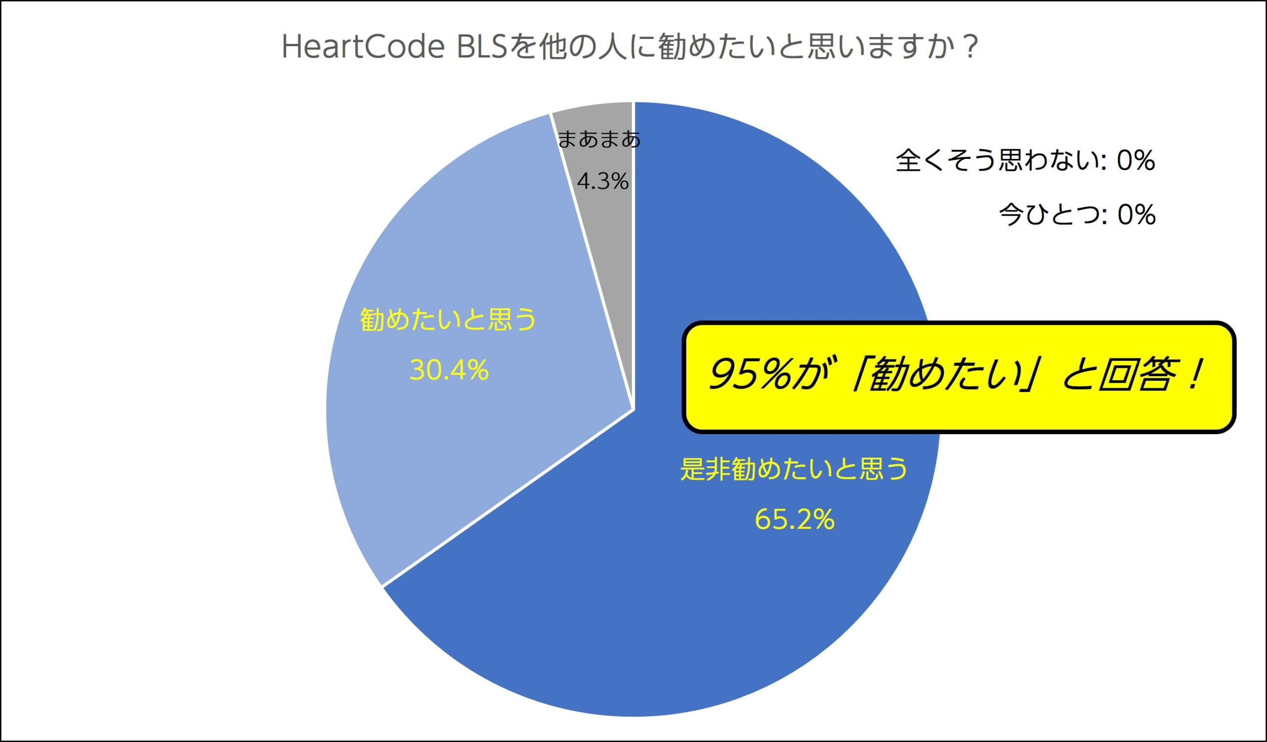 アンケート結果からわかるように、多くの受講生から好評をいただいております。Part1(オンライン学習)については、自分のペースで繰り返し学習ができる点、事前に動画を確認できる点など、オンライン学習ならではのメリットを感じていただけました。また、Part2(スキルパート)の質が高いことはもちろん、時短である点も医療従事者の方にとっては有意義であるようです。従来のプロバイダーコースとは違う、新しい形のBLSコースを体験していただけたと感じています。今後は開催地を拡大し、より受講しやすい環境を作りHeartCode®BLSを多くのみなさまに提供できるよう努めます。